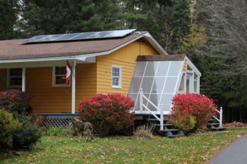 Prior to installation of the solar panels, the owner purchased an air-to-air heat pump to save on heating & cooling costs for the home. He reports that immediately following installation, he saw savings of 25% on his heating bills. As long as the temperature is about -5°C, it can heat the entire house on its own. For temperatures down to -12°C, the heat pump runs in conjunction with a wood-burning stove. Any colder and the heat pump is turned off and the house is run solely on wood, as the owner states it is no longer efficient to use the heat pump. The electric heaters within the home are almost never used. The total cost of the heat pump was about $4000.
