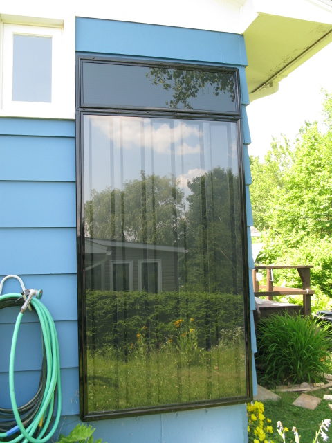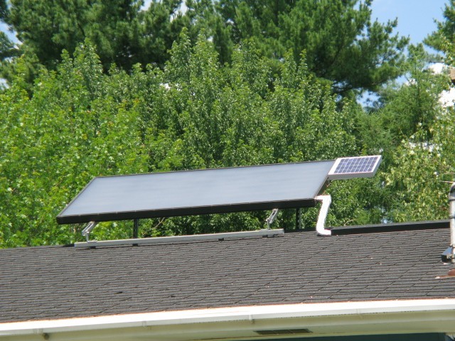 They also decided to have solar energy help offset their oil and electricity use. They have a solar hot air unit (Solarsheat) installed to offset space heating needs. The unit draws cool air from the basement and heats it, circulating it with a built in PV powered fan into the upstairs living space.