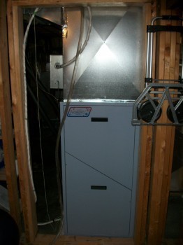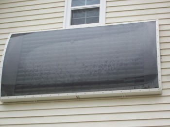 The smaller Cansolair collector was installed at a 90° angle facing the southern sky. According to the manufacturer, the automatic fan control begins to blow hot air from the collector into the home at when it is 43.3 °C (110 °F) and stops when the air is only 32.2 °C (90 °F).