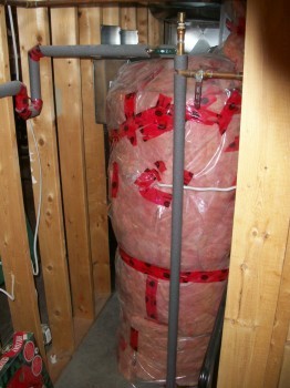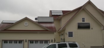 The homeowners did not stop there. They have been impressed with the performance of their two solar hot water collectors. A pump connected to the collectors, which is powered by a 20 W photovoltaic panel, circulates non-toxic glycol through the solar collectors, where it is warmed, to a heat exchanger, which transfers the heat collected from the sun to their hot water storage tanks. They use one electric hot water tank for back-up, and one tank for storing hot water from to the solar collectors. However, the solar collectors work so well that when the electric coil in the hot water tank broke, it took three weeks before they noticed, because their solar hot water collector was providing plenty of hot water!